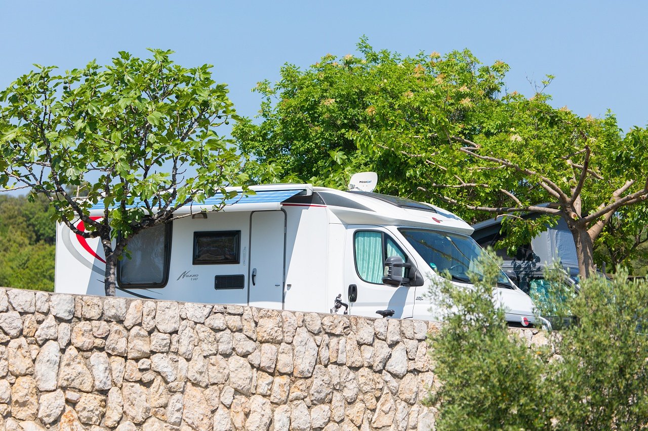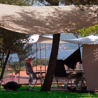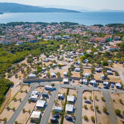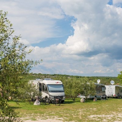 Krk. Parcela uključuje auto + kampprikolicu; kamper auto + šator. Na parceli se nalazi električni priključak, priključak za vodu i odvod, Wi-Fi.