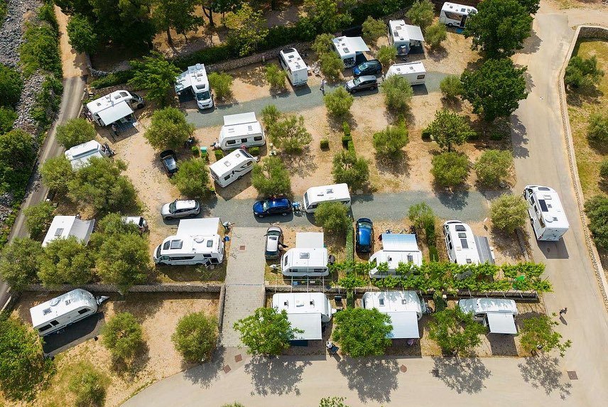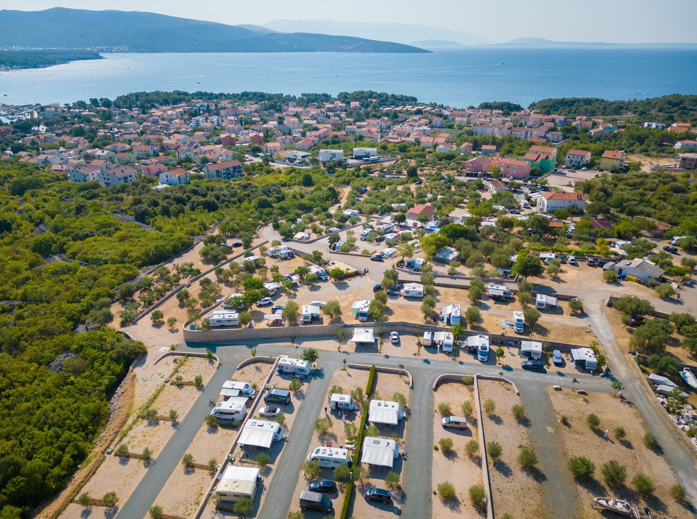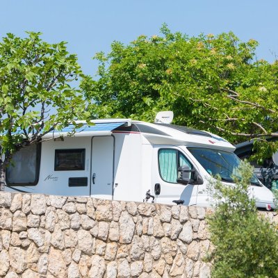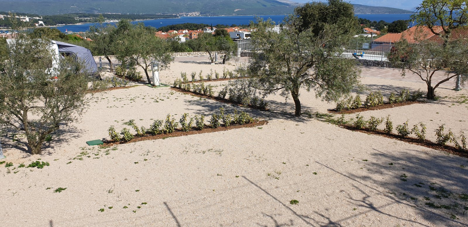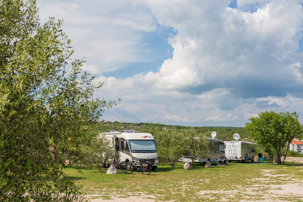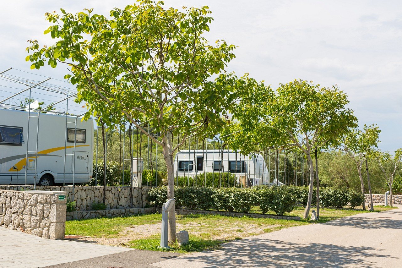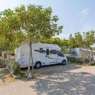 Krk. Parcela uključuje auto + kampprikolicu; kamper auto + šator. Na parceli se nalazi električni priključak, priključak za vodu i odvod, Wi-Fi.